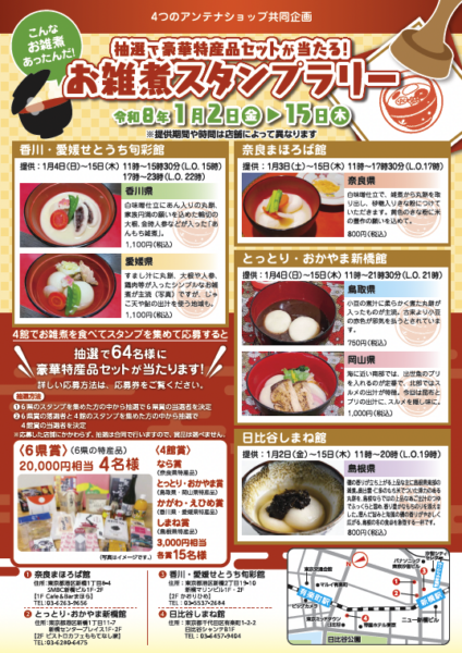 4つのアンテナショップでお雑煮を食べ、スタンプを集めて応募すると抽選に参加できます。