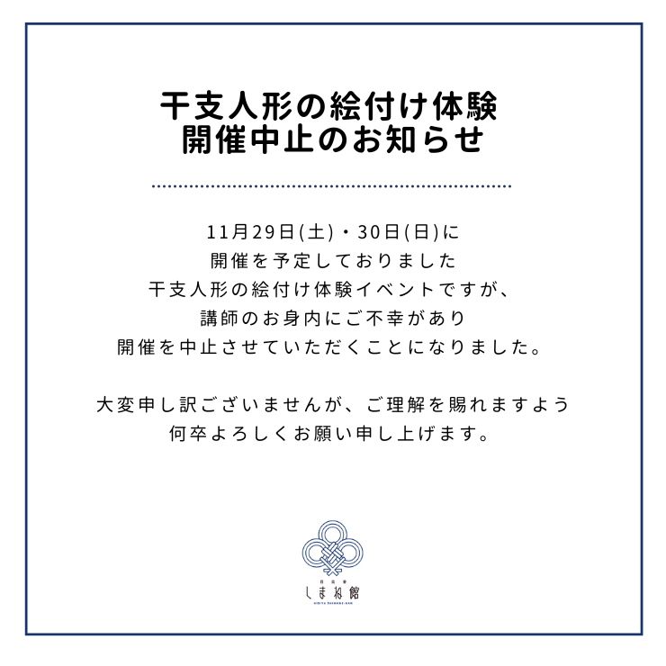 11月29日(土)・30日(日)に開催を予定しておりました「干支人形の絵付け体験」につきまして、 講師のお身内にご不幸があったため、誠に勝手ながら開催を中止させていただくこととなりました。